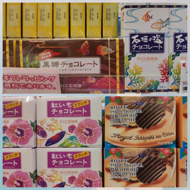 ช็อคโกแลตน้ำตาลทรายดำ ช็อคโกแลตเกลือจากเกาะอิชิกะคิ ครั้นช์มันม่วง และมันฝรั่งเคลือบช็อคโกแลตโรยเกลือจากอิชิกะคิ