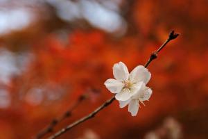 ซากุระฤดูหนาวอีกพันธุ์หนึ่ง กำลังบานประชันใบไม้แดง