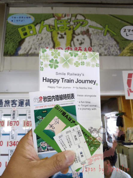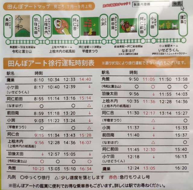 ที่จังหวัดนี้ มีแปลงนาที่จัดทำศิลปะบนนาข้าว ถึง 5 จุด แต่ละแปลงเป็นแปลงเล็กๆ และการชม จะอาศัยการนั่งชมบนรถไฟ ของผู้ให้บริการ Akitanai Rikujukan ระหว่างสถานี Takanosu(鷹ノ巣駅)และ สถานี Kakunodate(角館駅) โดยรถไฟจะหยุดให้ชมแต่ละจุด ราวๆ 1-2 นาที เพื่อให้ได้ถ่ายรูปชม แต่ไม่สามารถลงไปได้นะครับ เพราะอยู่ระหว่างสถานี และไม่แนะนำให้ลงไป เพราะมีรอบรถไฟ 1-2 ชั่วโมง ถึงจะมาขบวนหนึ่ง ถ้าลงแล้ว คือต้องเสียเวลาอีกยาวเลย