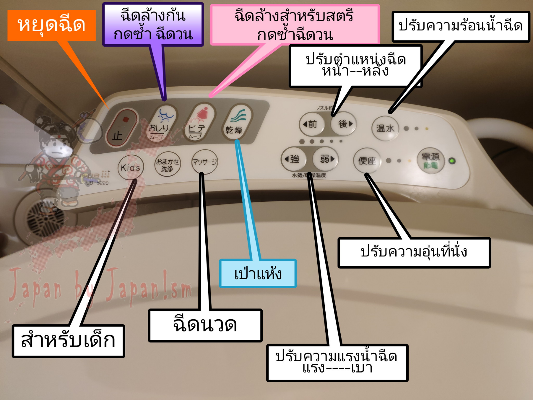 - ปุ่มนวด หรือ ฉีดแบบแรงสลับเบา เสมือนเป็นการนวด เพื่อช่วยกระตุ้นการขับถ่ายได้ดียิ่งขึ้น