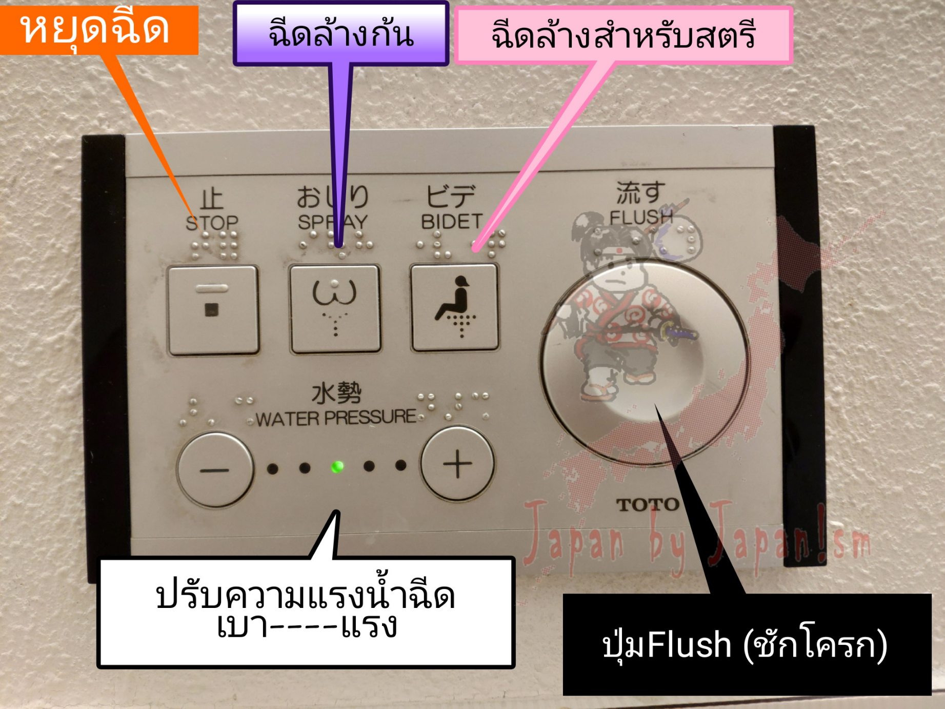 นอกจากนี้ ก็ยังมีอีกปุ่มหนึ่ง ที่สร้างปัญหา ไม่น้อยไปกว่าปุ่มอันหลากหลายที่ว่ามาเลยทีเดียว นั่นก็คือ ปุ่มทำลายหลักฐาน ปุ่มชำระล้าง หรือ ปุ่ม Flush น้ำ นั่นเอง เพราะบางครั้งก็เป็นปุ่มติดอยู่ในแผงพาเนล (Panel) รวมกับปุ่มฉีดต่างๆ บางครั้งก็เป็นแบบเซ็นเซอร์อัตโนมัติ หรือต้องใช้มือทาบ หรือแบบดั้งเดิม เป็นคันโยกด้านหลังถังน้ำ ซึ่งดูเหมือนไม่เป็นปัญหา แต่ถึงเวลาจริงๆ ก็สร้างปัญหาได้ไม่น้อย
