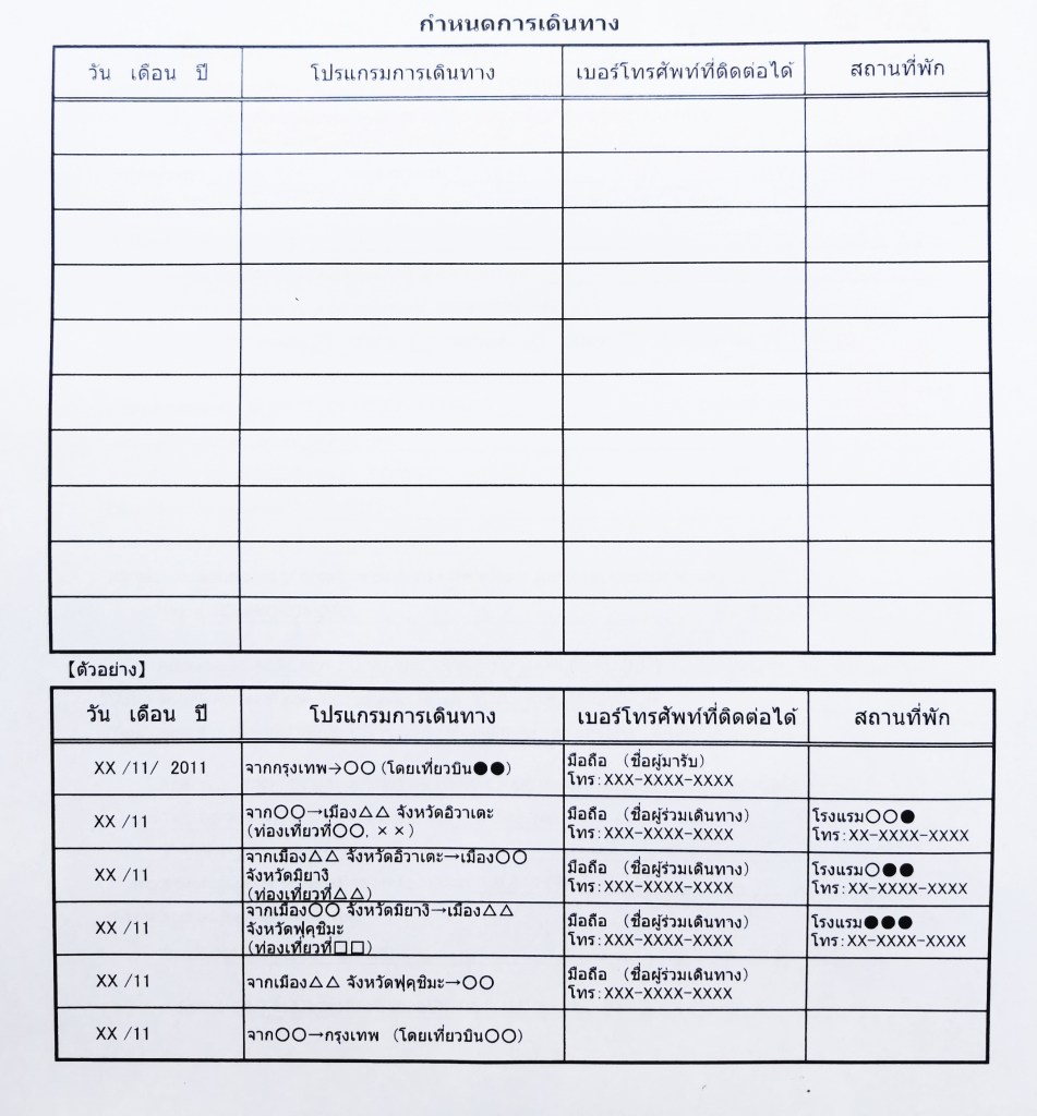 - รายชื่อบุคคลร่วมทริิป เป็นภาษาอังกฤษ เพราะยังจำกัดว่า ไปในลักษณะของทัวร์เท่านั้น จึงจำเป็นต้องมีรายชื่อของผู้ร่วมเดินทาง และ **ต้องมีชื่อไกด์ รวมถีงเบอรโทรศัพท์ติดต่อของไกด์ ที่ญี่ปุ่นด้วย ซึ่งแผ่นนี้ ถ้าไม่มี เจ้าหน้าที่ไม่รับยื่นครับ ให้กลับไปเตรียมมาให้พร้อม